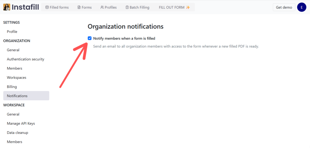 When this box is checked, Instafill.ai will automatically send emails to organization members who have access to the form whenever a filled PDF is ready.