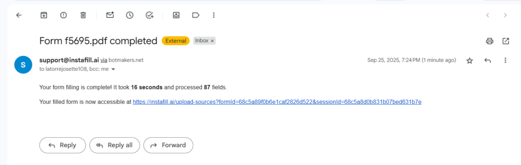The email contains the processing time, the number of processed fields, and a direct link to open the filled PDF in your Instafill.ai account. This way, the right people are informed immediately, and no one has to guess whether a form has finished processing or if it is ready for review.