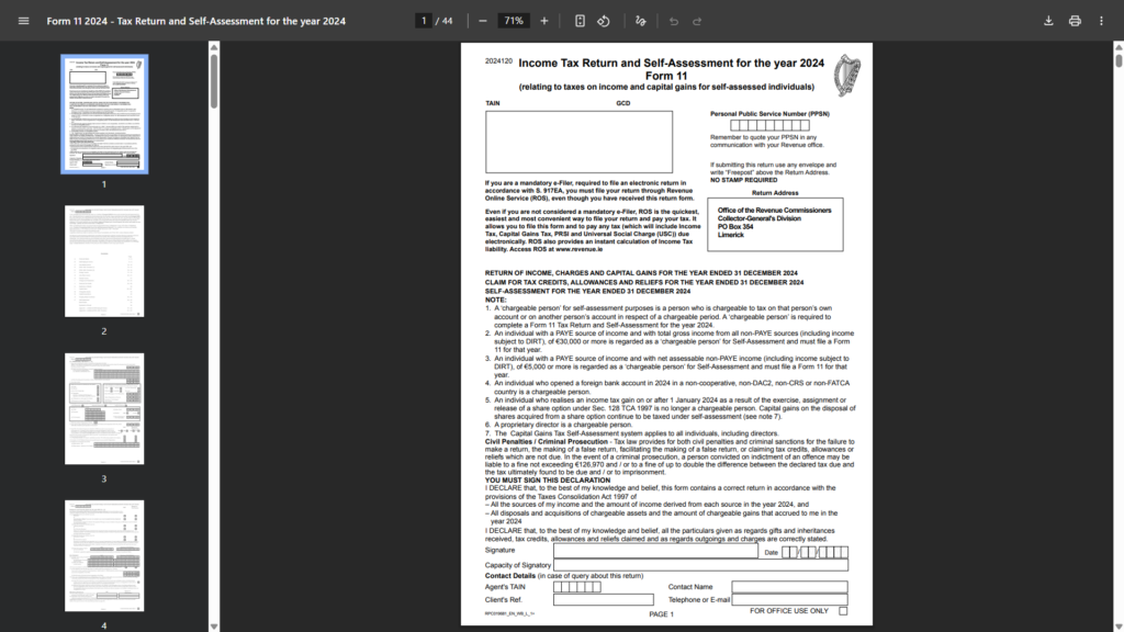 Instafill.ai has reached a new milestone by automating Ireland’s official Form 11 – Tax Return and Self-Assessment 2024 – a 44-page government PDF containing 3,885 fillable fields. This is the largest and most complex form we have processed to date.