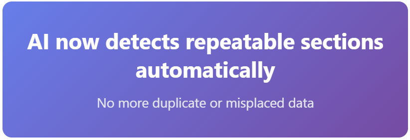 The AI now automatically identifies repeatable sections during form processing. The system analyzes the complete form structure, recognizes when identical field groups repeat across pages, and maps each section distinctly.