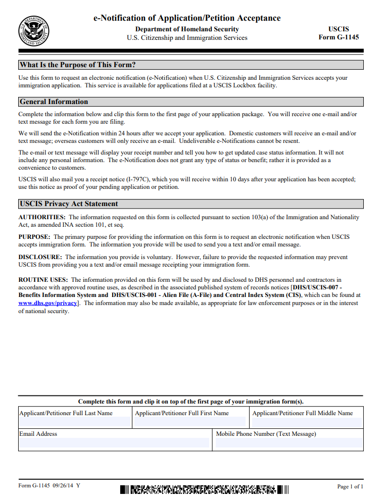 4. Form G-1145, E-Notification of Application/Petition Acceptance