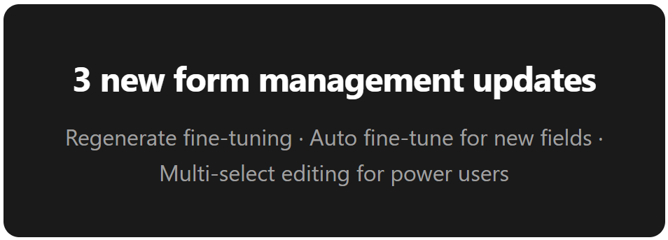 Regenerate fine-tuning and auto fine-tune for new fields are available now for all users on paid plans. You’ll find the Regenerate button in the form details panel of any form with completed or failed fine-tuning.