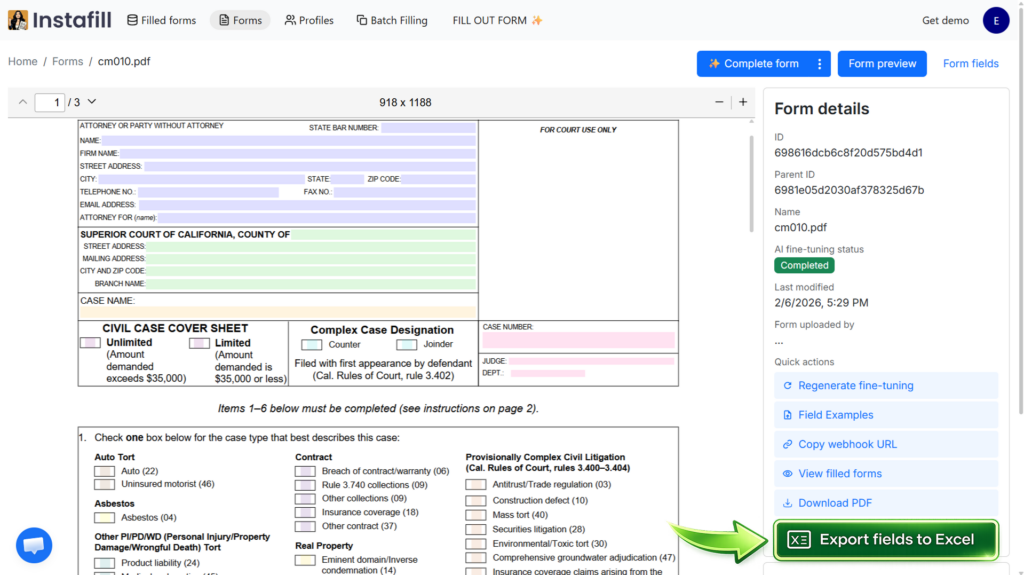 Exporting fields to Excel is now available to all users on paid plans. The button appears in the Quick actions panel on the form details page for any form with completed fine-tuning. No additional setup needed.